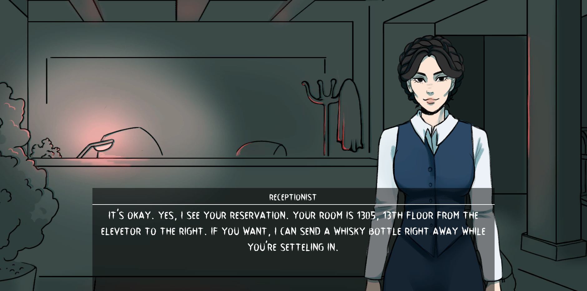 Floor 13 is a visual novel, following a character who got stuck in a hotel, and has to talk his way out of this situation